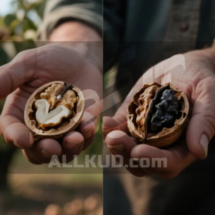 - خشک کردن غیراصولی: جدا نکردن فوری پوست سبز پس از برداشت و یا خشک کردن گردوها زیر نور مستقیم و شدید آفتاب، دو اشتباه رایج و نابخشودنی است که به سرعت رنگ مغز را تیره میکند.